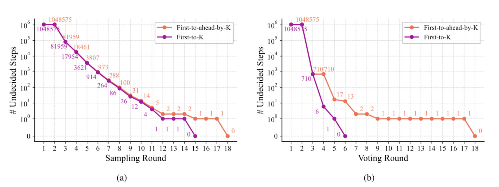The number of undecided steps falls exponentially across voting rounds, confirming the efficiency of race-to-k voting for local reliability.